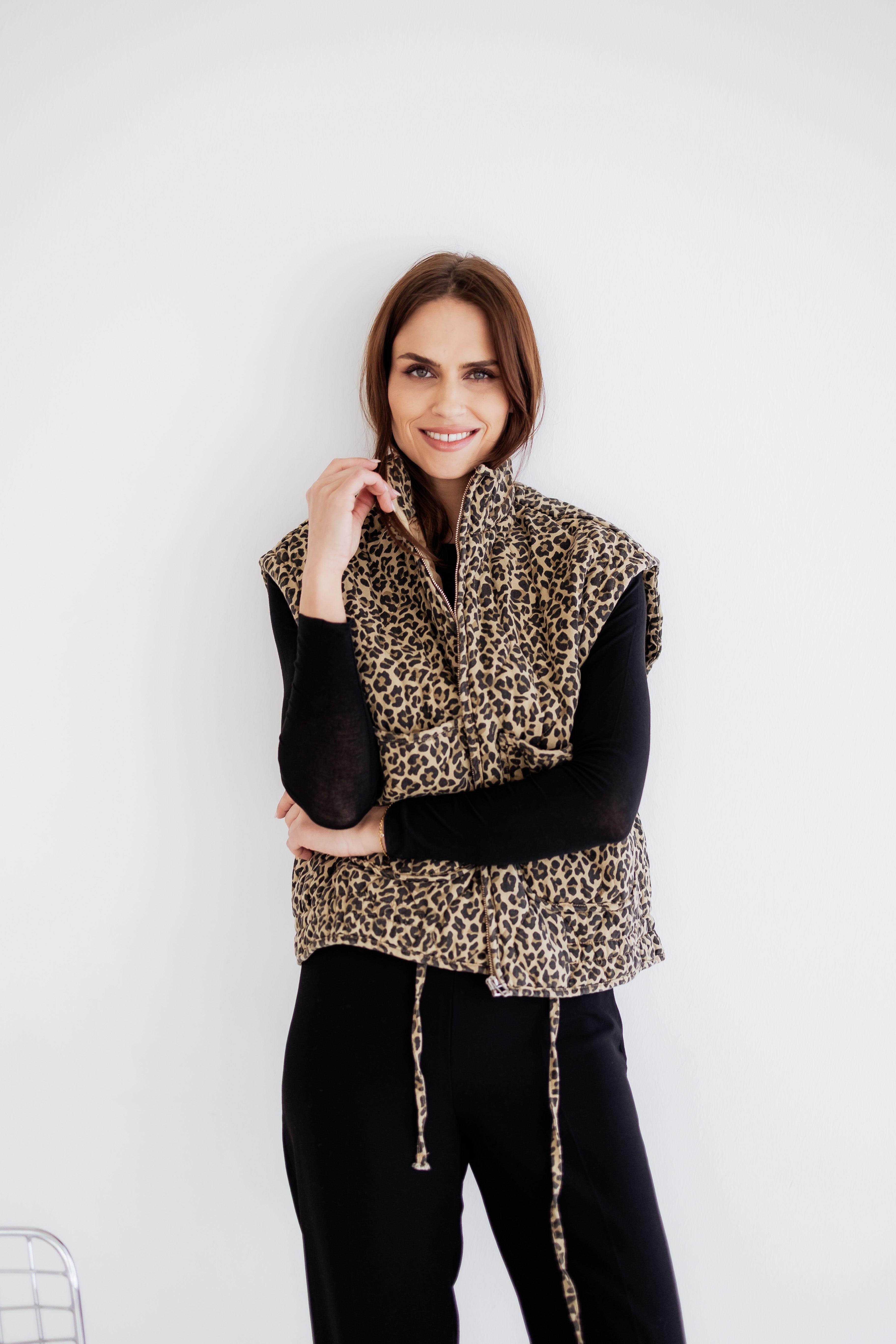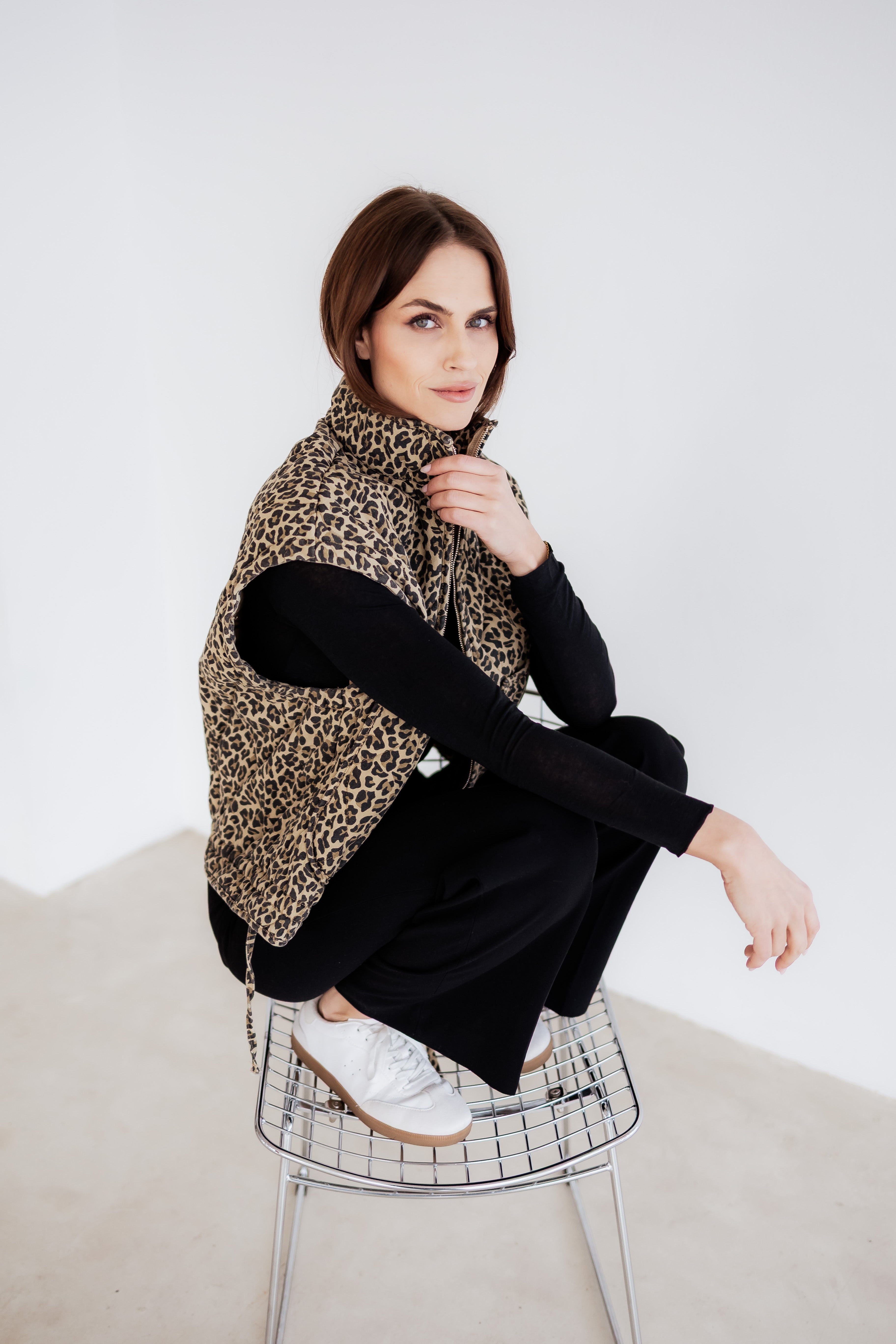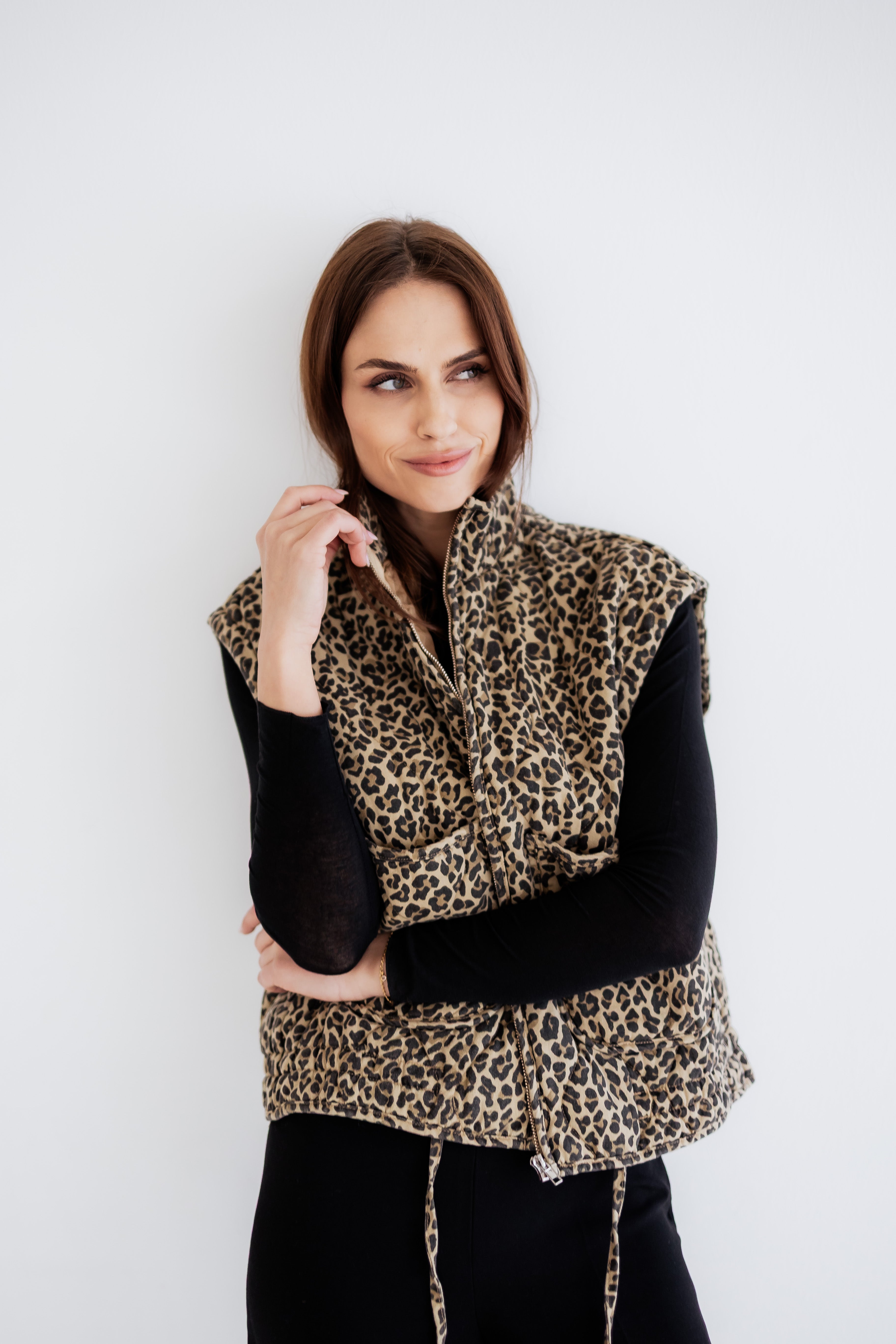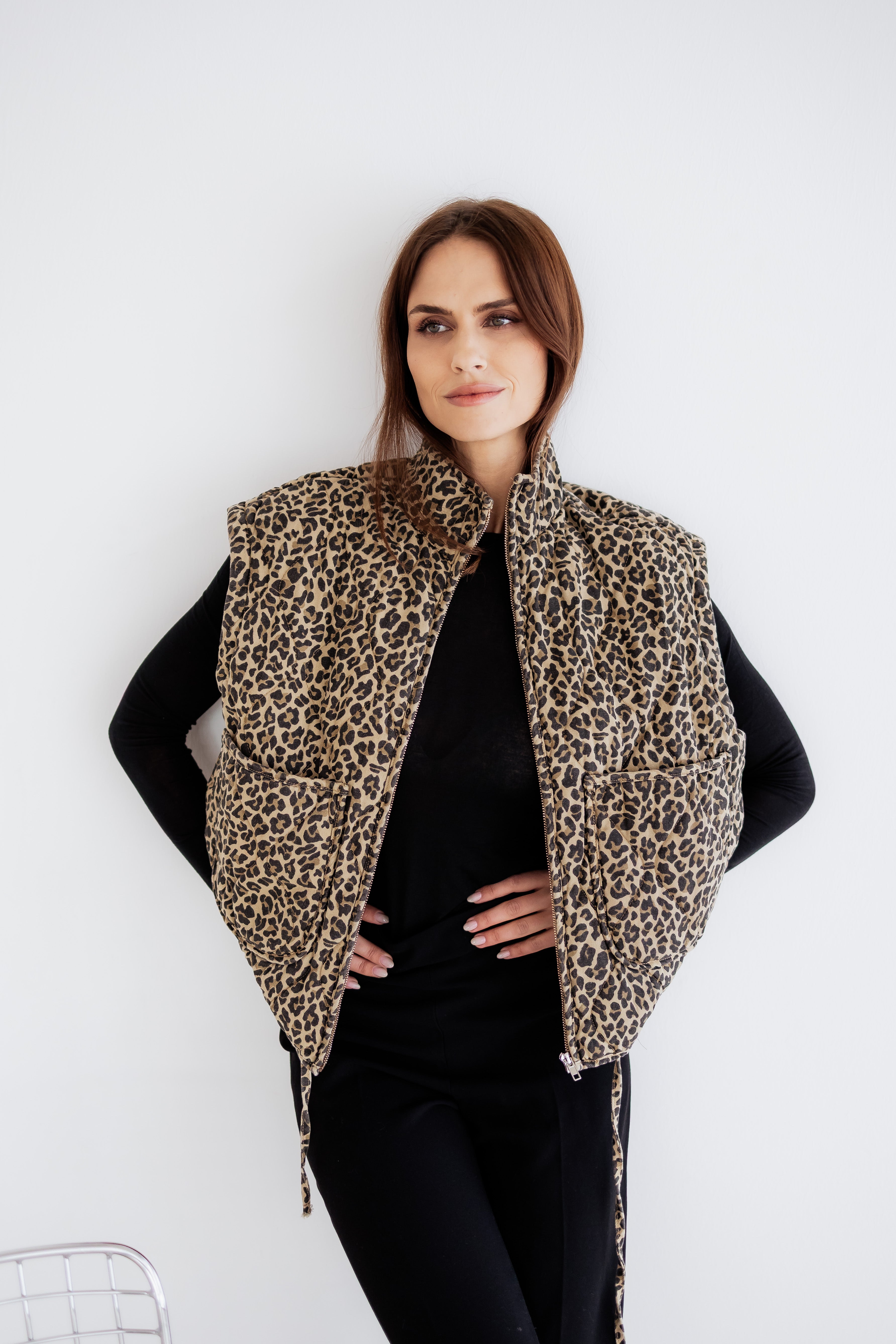 - ärmellose gesteppte Denim-Weste mit Leomuster