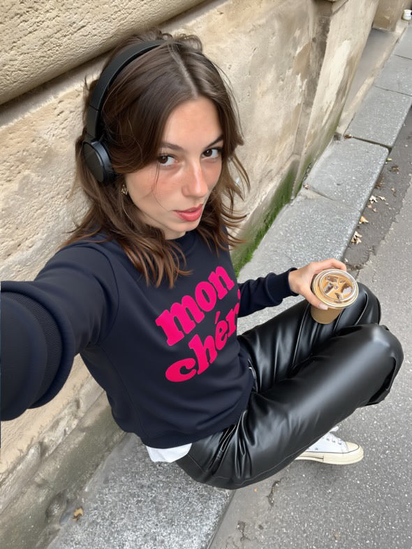 - lässiges Sweatshirt in dunkelblau mit rotem Flock "Mon Cheri"