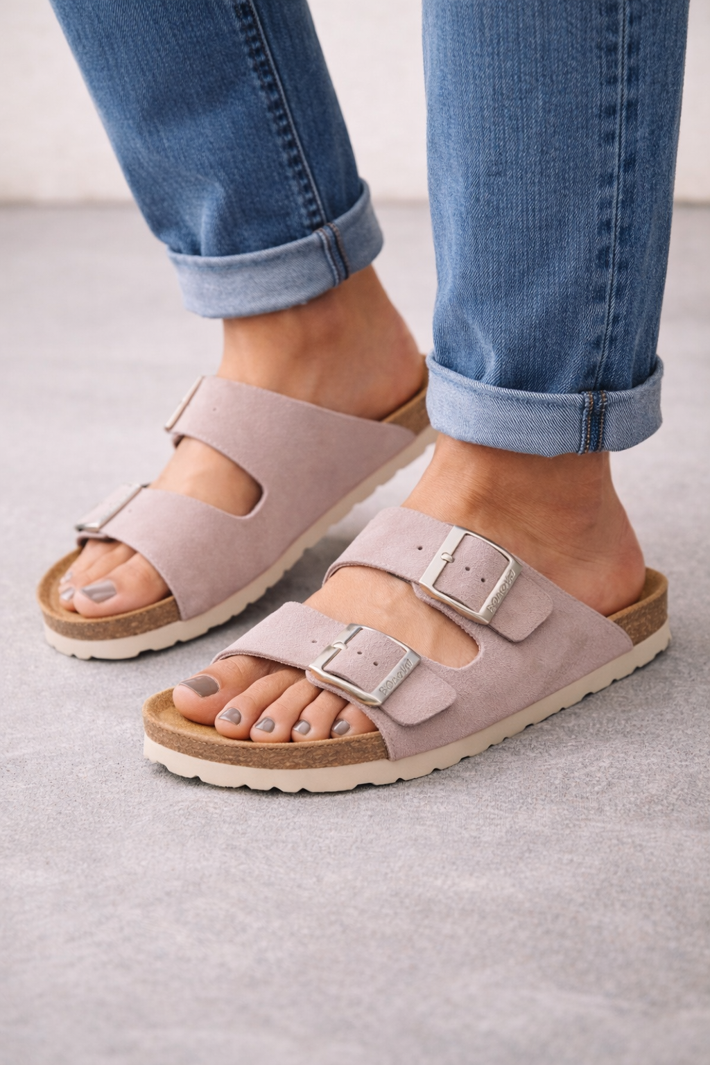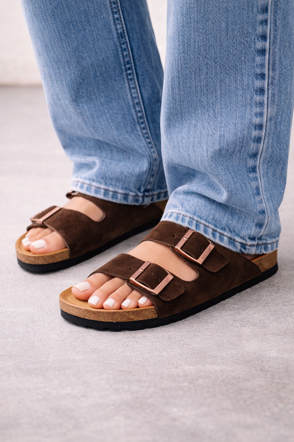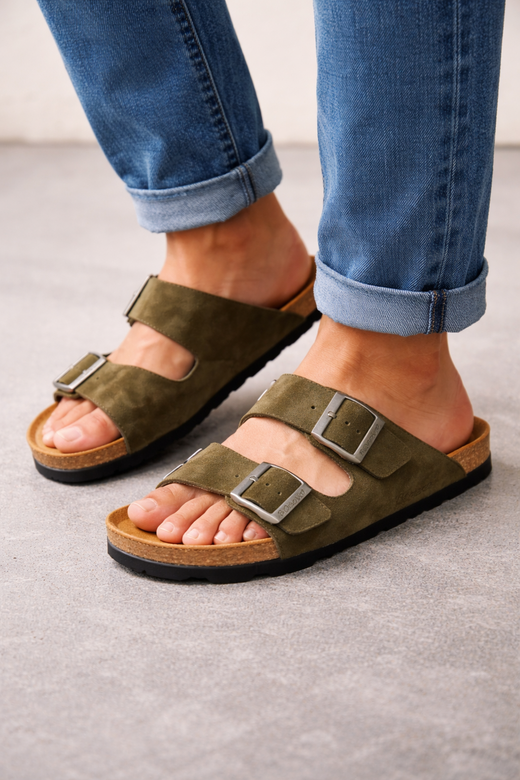 Unsere Sandalen verbinden nachhaltige Materialien mit modernem Komfort. Das Fußbett besteht aus Kork und Naturkautschuk – gewonnen aus nachwachsenden Rohstoffen wie Korkeichen und Kautschukbäumen. Diese natürliche Basis sorgt für Stabilität, Flexibilität und ein angenehmes Tragegefühl.
