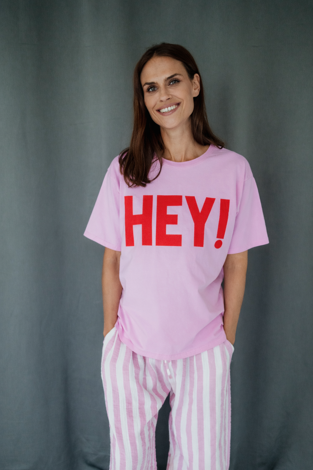 - lässiges Oversize T-Shirt mit großflächigem, buntem Schriftzug "HEY!"