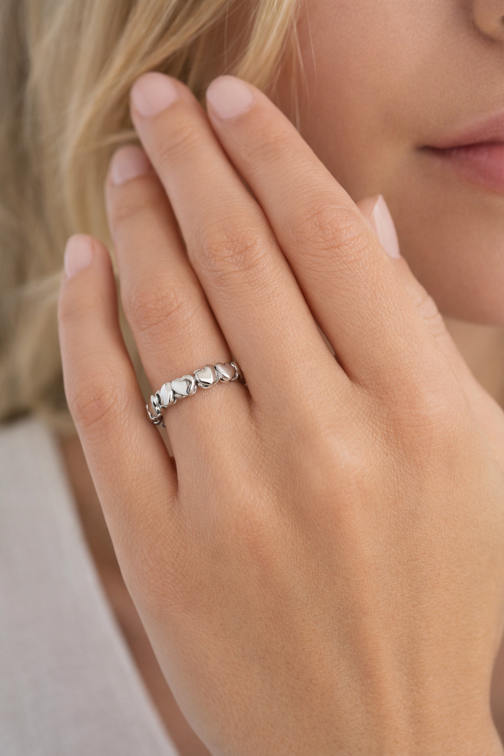 Dieser filigrane Ring aus 925 Sterlingsilber vereint zeitlose Eleganz mit liebevollen Details. Die aneinandergereihten Herzformen schmiegen sich sanft um deinen Finger und stehen für Verbundenheit, Liebe und kleine Momente voller Gefühl.
