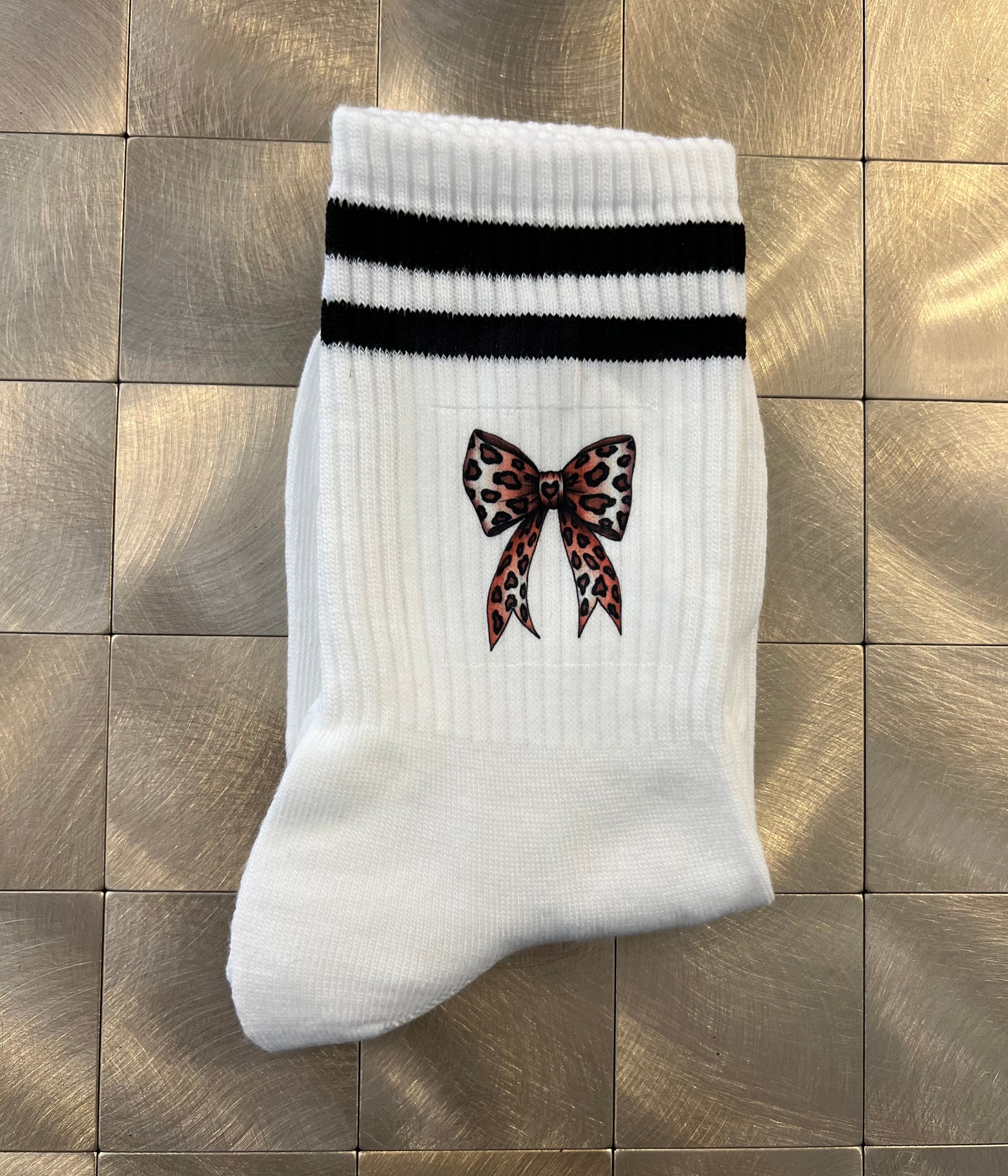 Weiße Socken mit Stick, Streifen und süßer Leoschleife