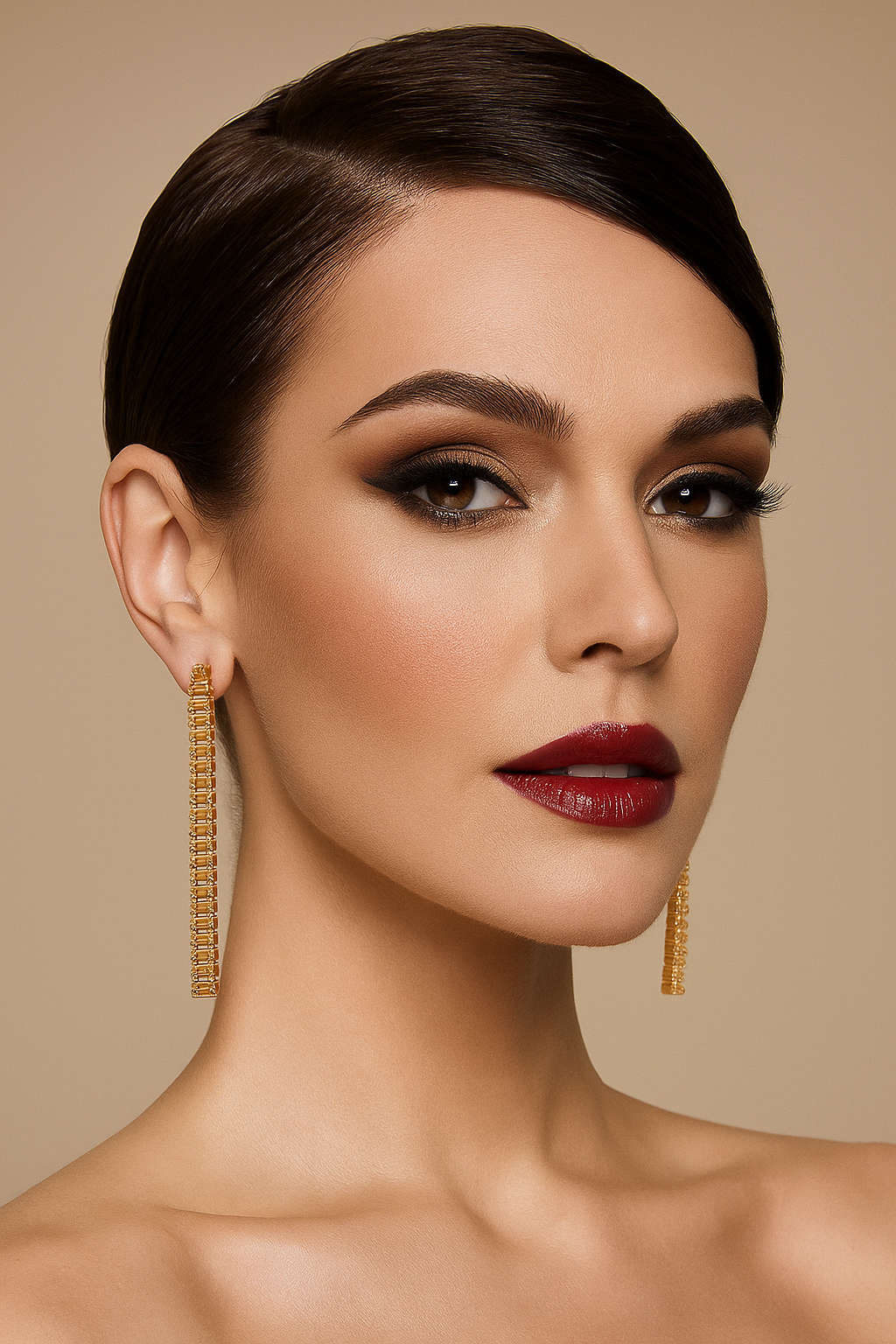 Die abgebildeten Ohrringe sind elegante, lange Statement-Ohrringe in Gold und Silberoptik. Ihr Design zeichnet sich durch feine, rechteckig angeordnete Elemente aus, die dem Schmuckstück eine moderne und zugleich luxuriöse Ausstrahlung verleihen. Sie ergänzen perfekt einen glamourösen Look und betonen Gesicht und Hals auf stilvolle Weise.