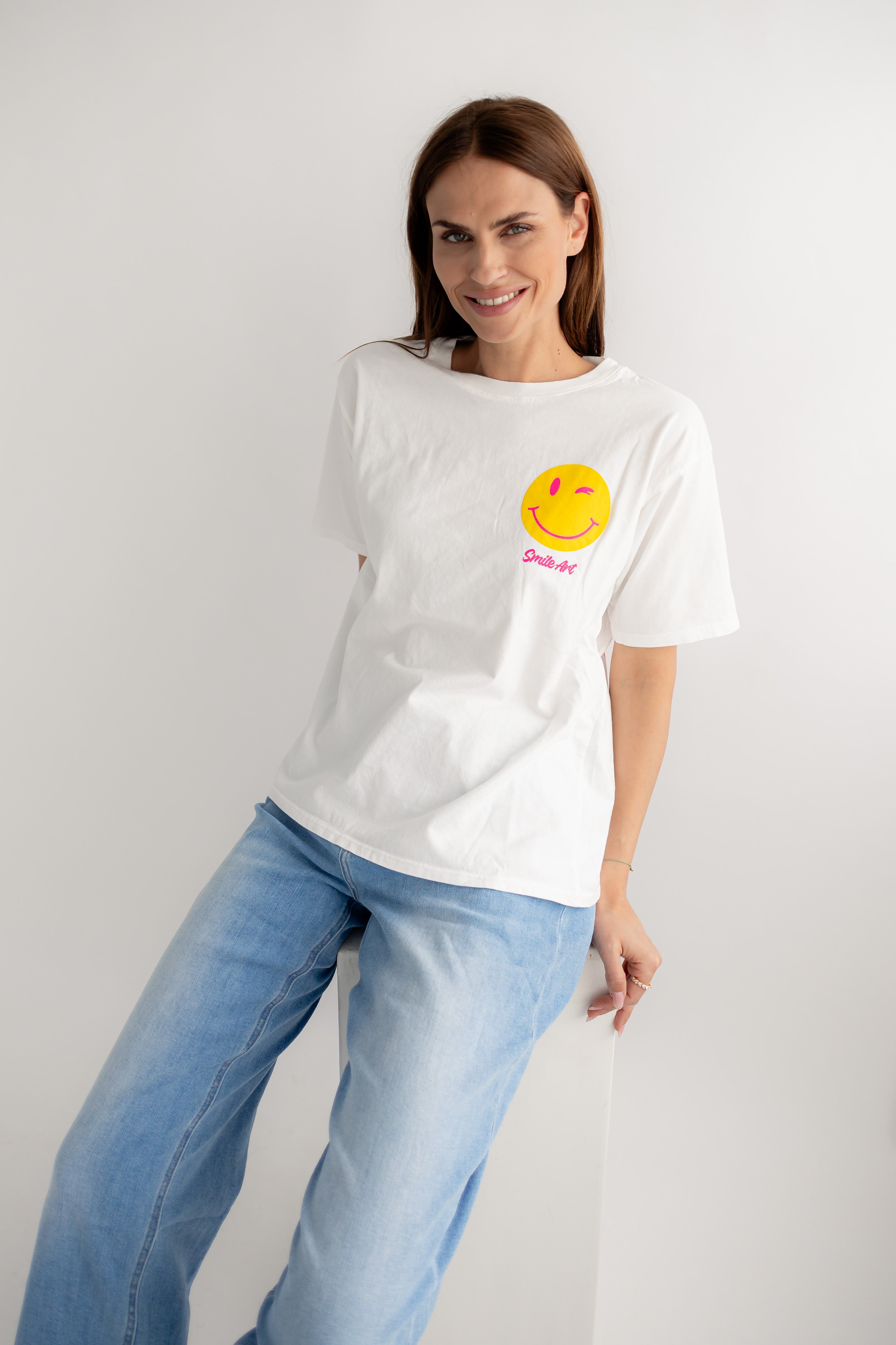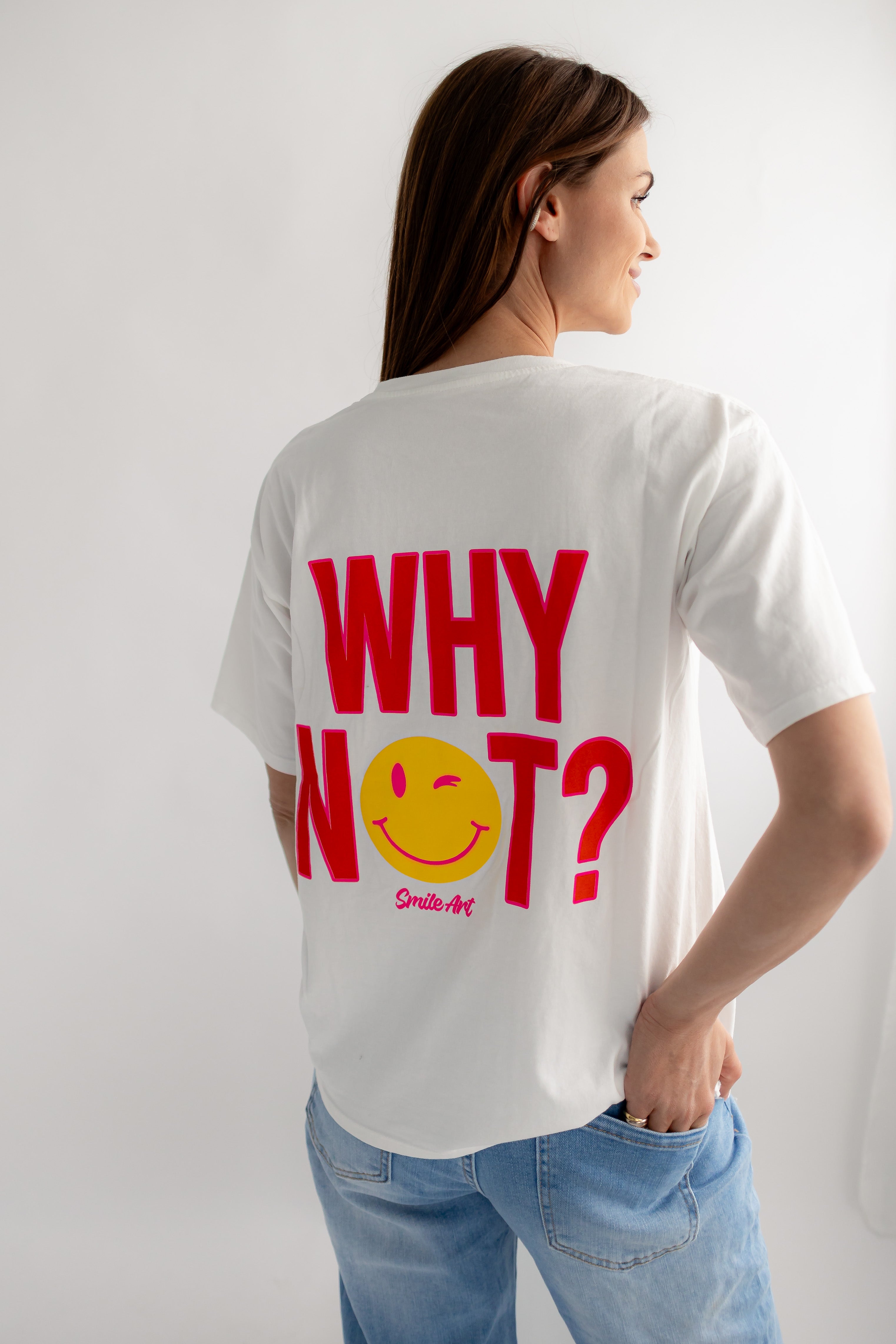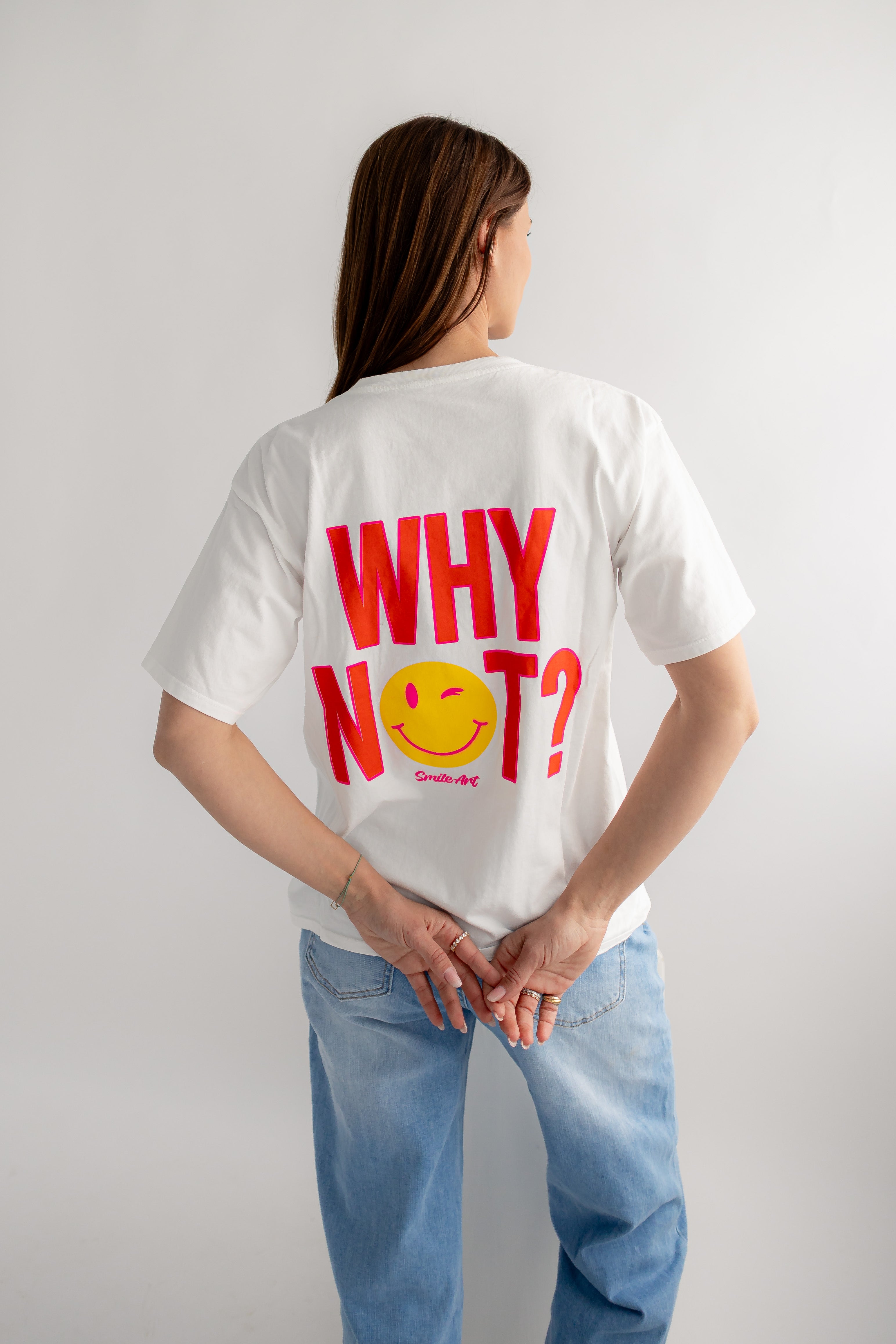 • weißes T-Shirt mit Smiley auf der Brust und großem Backprint "WHY NOT"