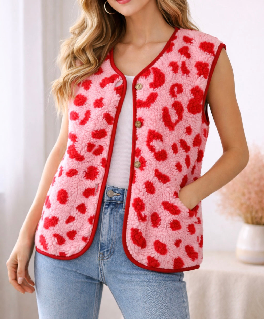 - ärmellose Teddyweste im Leolook in rot/ rosa und Pink/rosa