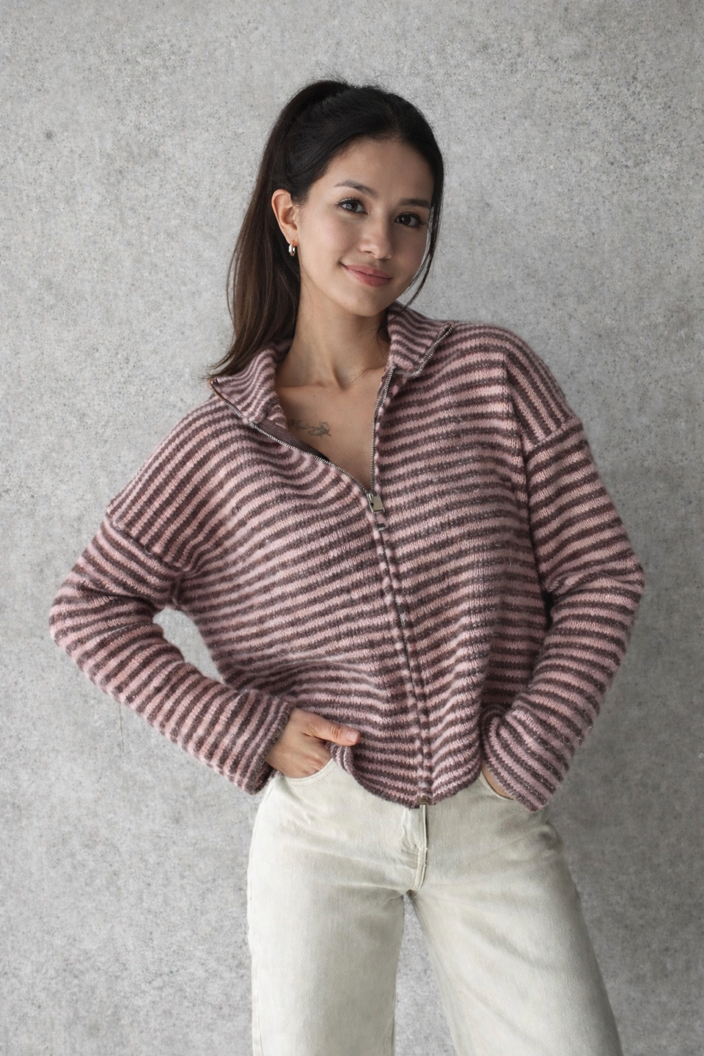 Unsere Bella Zip Strickjacke vereint Komfort und Style in einem modernen Look. Das weiche Material sorgt für ein angenehmes Tragegefühl, während der durchgehende Reißverschluss und das zeitlose Streifenmuster die Jacke zu einem echten Hingucker machen.